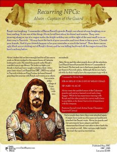 Just released on DriveThruRPG. Recurring NPCs – Alwin, Captain of the King’s Guard. A good friend for adventurers, or just citizens in need. Check him out here.